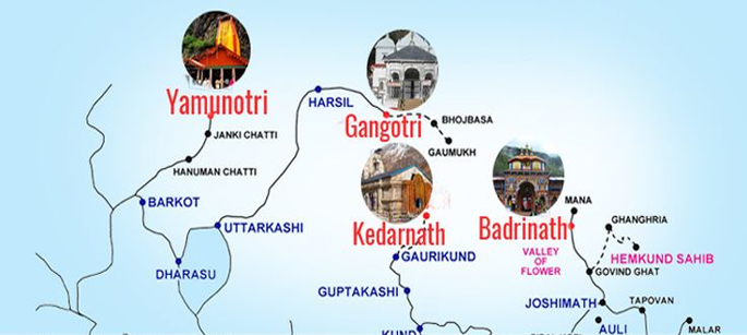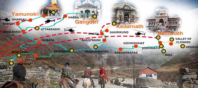 Dehradun – Mussoorie – Chamba – Tehri – Dharasu – Naugaon – Barkot – SayanaChatti – HanumanChatti – Phoolchatti – Jankichatti – Yamunotri – Uttarkashi – Bhatwari – Gangnani – Harsil – Jangla – Bhaironghati – Gangotri (Gaumukh) – Srinagar – Rudraprayag – Augustmuni – Chandrapuri – Kund – Guptkashi – Phata- Rampur – Sitapur – Sonprayag – Gaurikund – Kedarnath – Ukhimath – Chopta – Gopeshwar – Chamoli – Pipalkoti – Joshimath (Auli) – Govindghat – Badrinath- Nandprayag – Karnprayag – Devprayag – Rishikesh – Haridwar